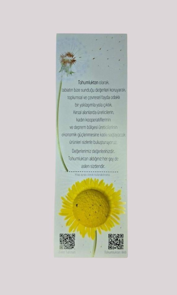 🌱 Kullanım Talimatı: Kitap ayracınızı kullandıktan sonra tohumlu kısmı toprağa yerleştirin, üzerini ince bir toprak tabakasıyla örtün ve düzenli sulayın. Kısa süre içinde toprakta hayat bulan kır çiçekleriyle doğaya katkı sağlayın.