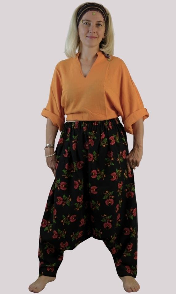 Karanlığın içinden fışkıran canlı çiçeklerin enerjisini üzerinizde taşıyın. "Gece Bahçesi Şalvar", ismini aldığı derin siyah zemin (patiska) üzerine işlenmiş göz alıcı Japon gülü (hibiskus) desenleriyle, otantik stilin ve bohem ruhun mükemmel bir temsilcisidir. Bu sadece bir kıyafet değil; bu, doğaya, sanata ve emeğe duyulan bir saygı duruşudur.