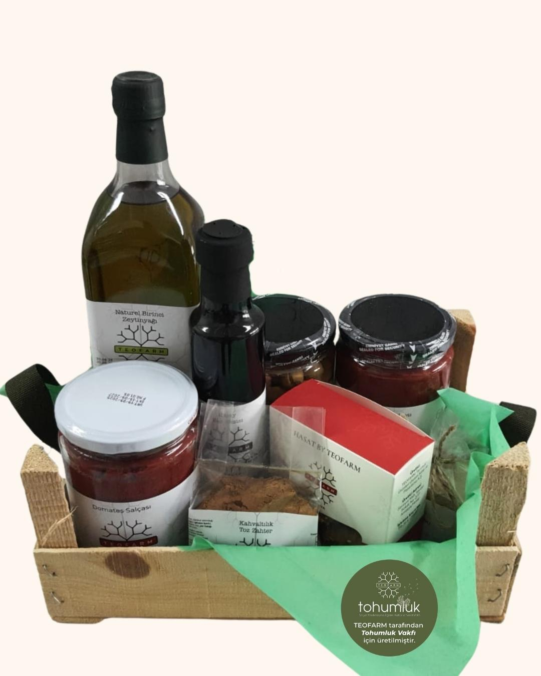 Teofarm çiftliklerinin mahsullerinden ev yapımı reçetelere, kahvaltılıkların yıldızından kişisel bakımın en saf haline kadar, bu sepet Hatay'ın ruhunu taşıyor.